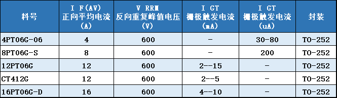 重要参数: ※ 正向平均电流:4A - 16A ※ 反向峰值电压:600V ※ 栅极触发电流:2mA - 200mA ※ 封装外型:TO 252