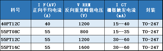 重要参数: ※ 正向平均电流:40A - 55A ※ 反向峰值电压:800V - 1600V ※ 栅极触发电流:15mA - 60mA ※ 封装外型:TO 247